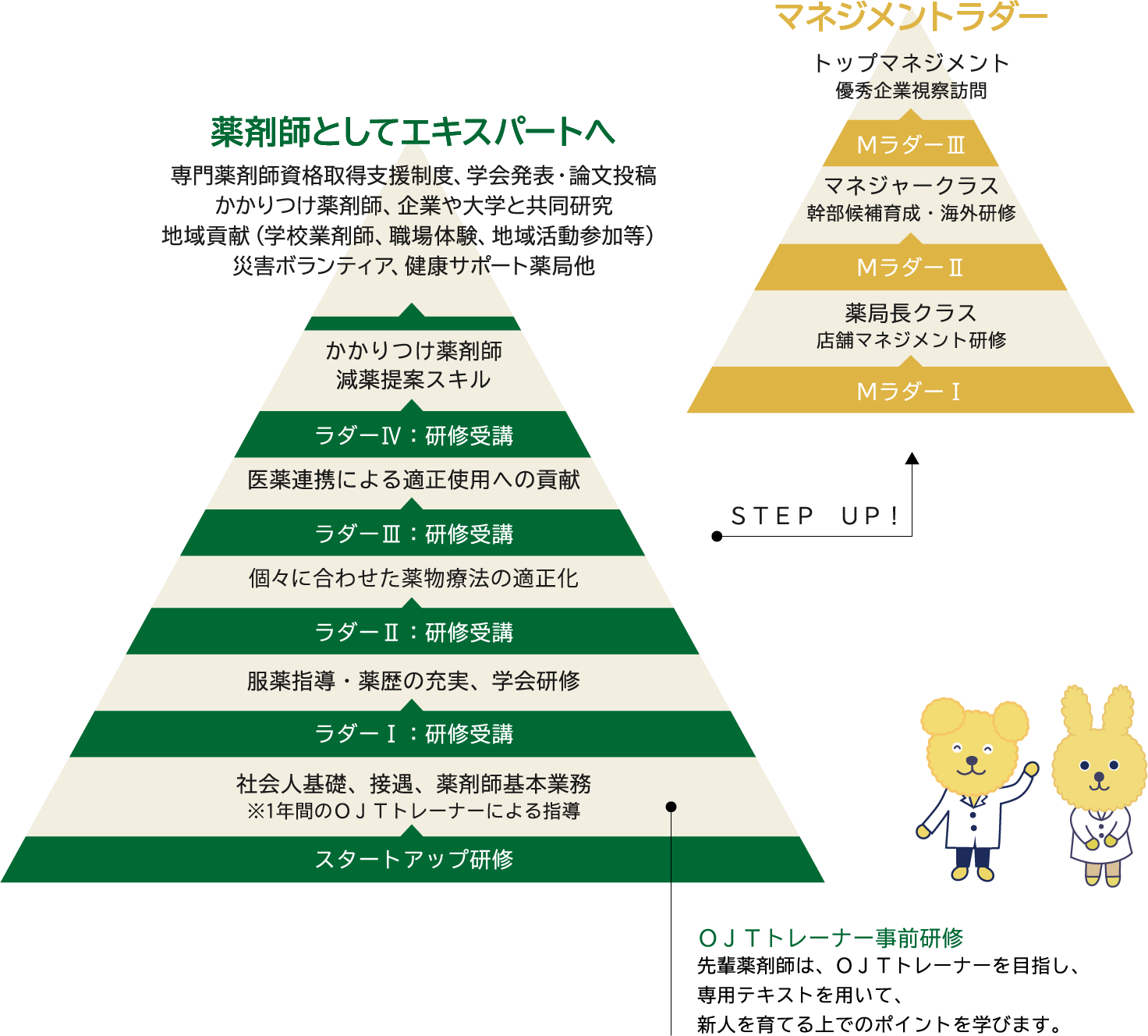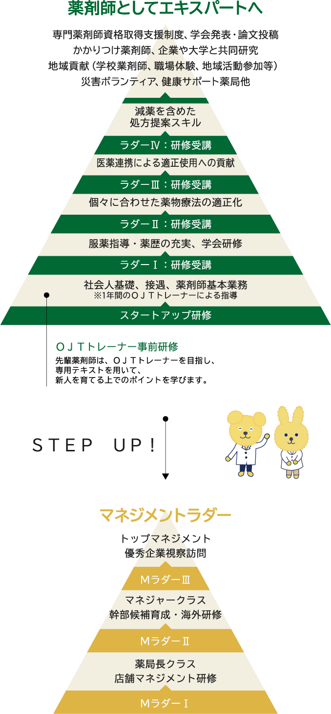 一人ひとりのレベルに応じて成長・活躍を継続的に支援するラダー方式による研修制度。新入社員からベテラン社員まで全社員が、はしご(ラダー)をのぼるように段階に応じてスキルアップを図ることができる制度です。研修で学べることは薬局薬剤師としての専門スキルだけではありません。目標に向かって自分自身を常に高める