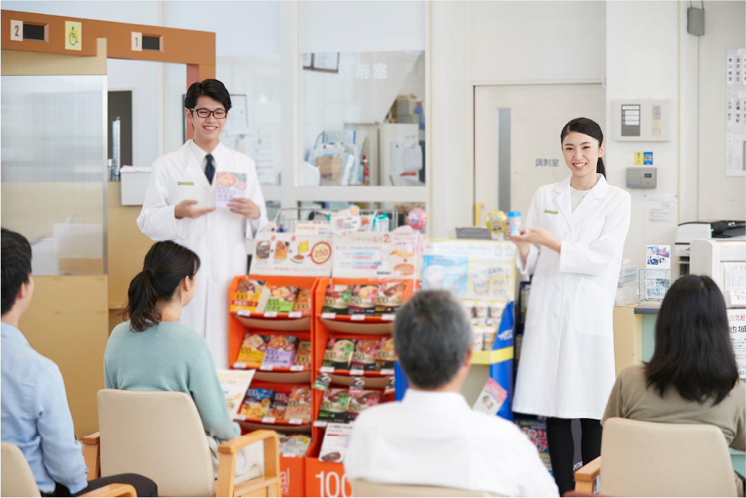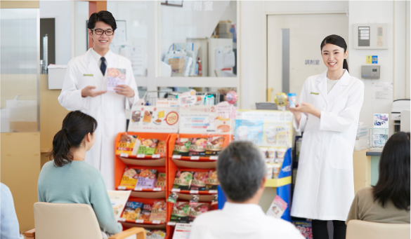 「健康サポート薬局」とは、「かかりつけ薬局」の機能に併せて、地域の皆さまの健康の維持や増進を積極的にサポートする薬局のことをいいます。健康サポートに必要な専門知識を習得した薬剤師が、運動や栄養管理に至るまで健康に関する様々な相談に応じます。また、どなたでもご参加いただける健康に関する店舗でのイベントを定期的に開催しながら、地域の皆さまへ情報を発信しています。ご相談の内容に応じて、医療や介護にかかわる様々な職種の方々と連携して、受診のご提案や各種サービスのご紹介を行います。