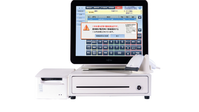 POSレジ 会計はバーコードスキャンで対応し、手打ちによるミスを防いでいます。セルフメディケーション税制の対象医薬品にも対応しています。