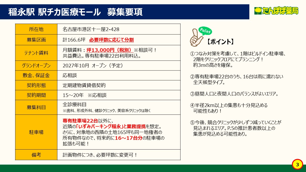 ●新築物件。グランドオープン:2027年4月(予定)。 ●上飯田駅から徒歩5分。 ●半径1kmの夜間人口が38,200人と非常に多い、名古屋市のベッドタウン。 ●計画物件につき、先生の要望する必要坪数に変更することが可能! ●内科が入居内定。診診連携が図れます。