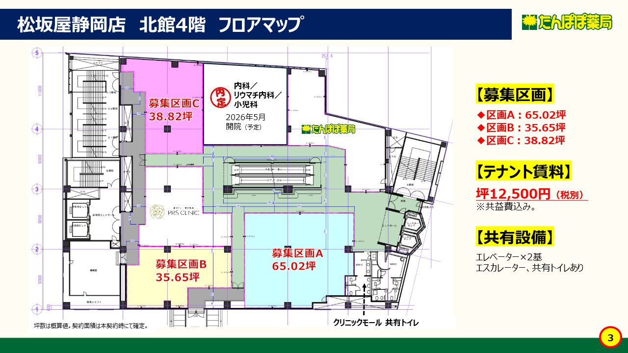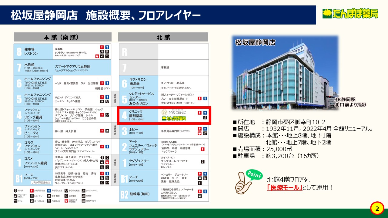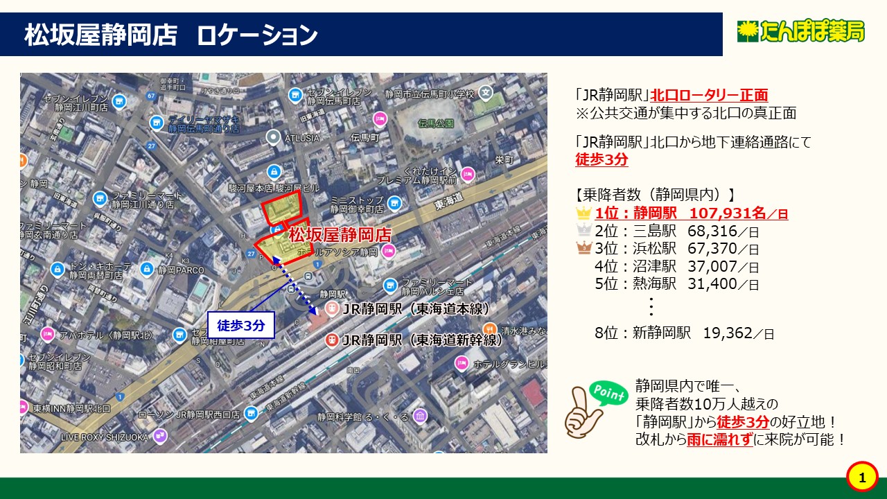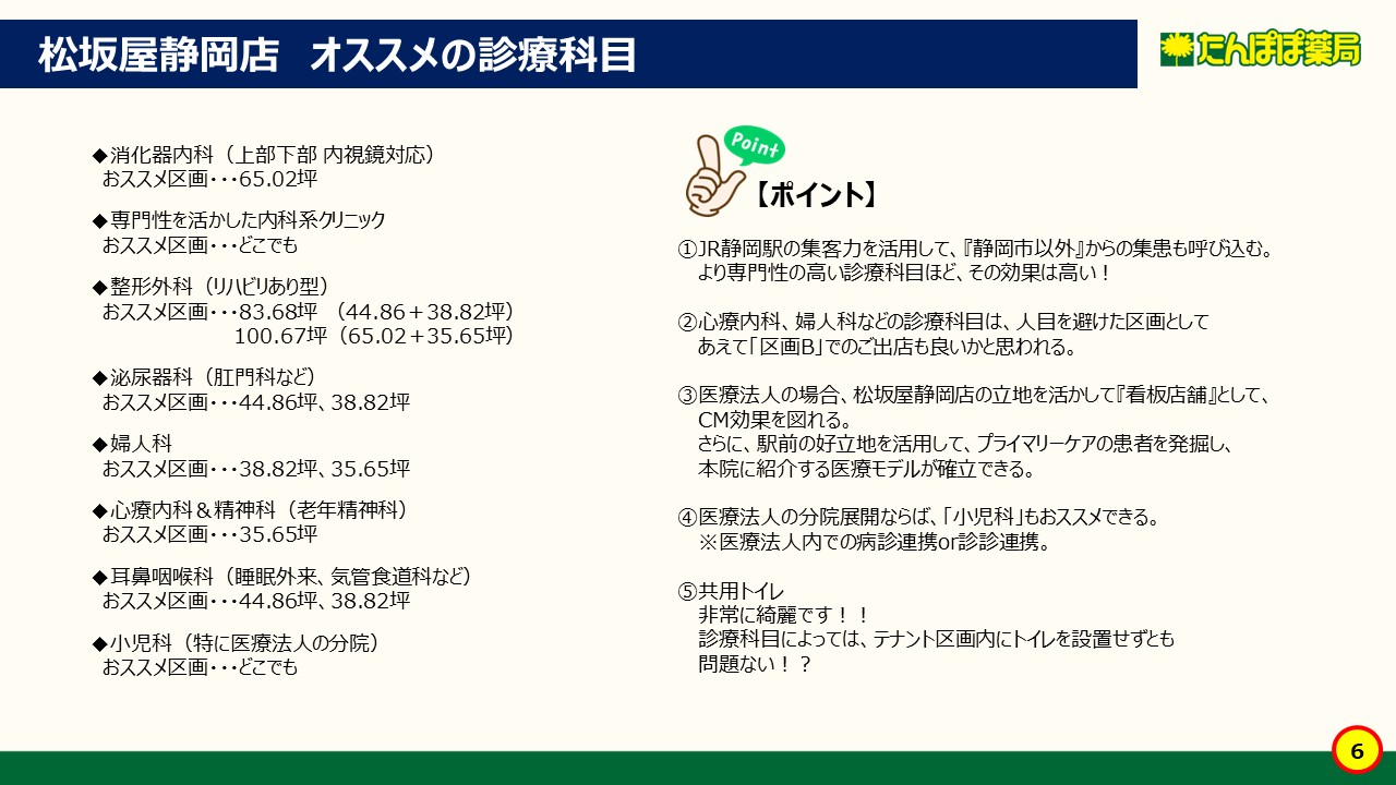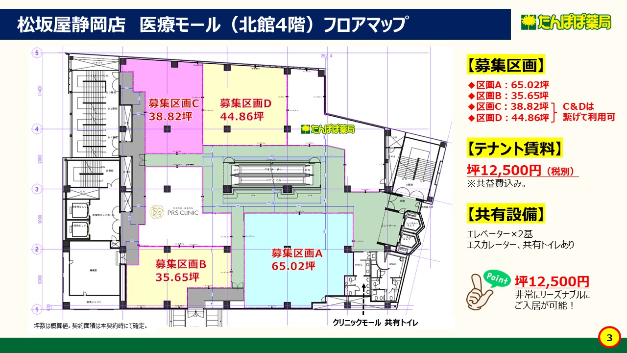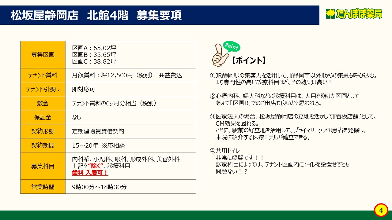 ●松坂屋静岡店北館4階の医療モール。 ●公共交通が集中する「JR静岡駅」北口の真正面の物件! ●「JR静岡駅」北口から地下連絡通路にて徒歩3分の好立地! ●坪12,500円=リーズナブルな賃料設定。 ●35.65坪~100.67坪と開業ニーズに併せて区画をお選び頂けます!