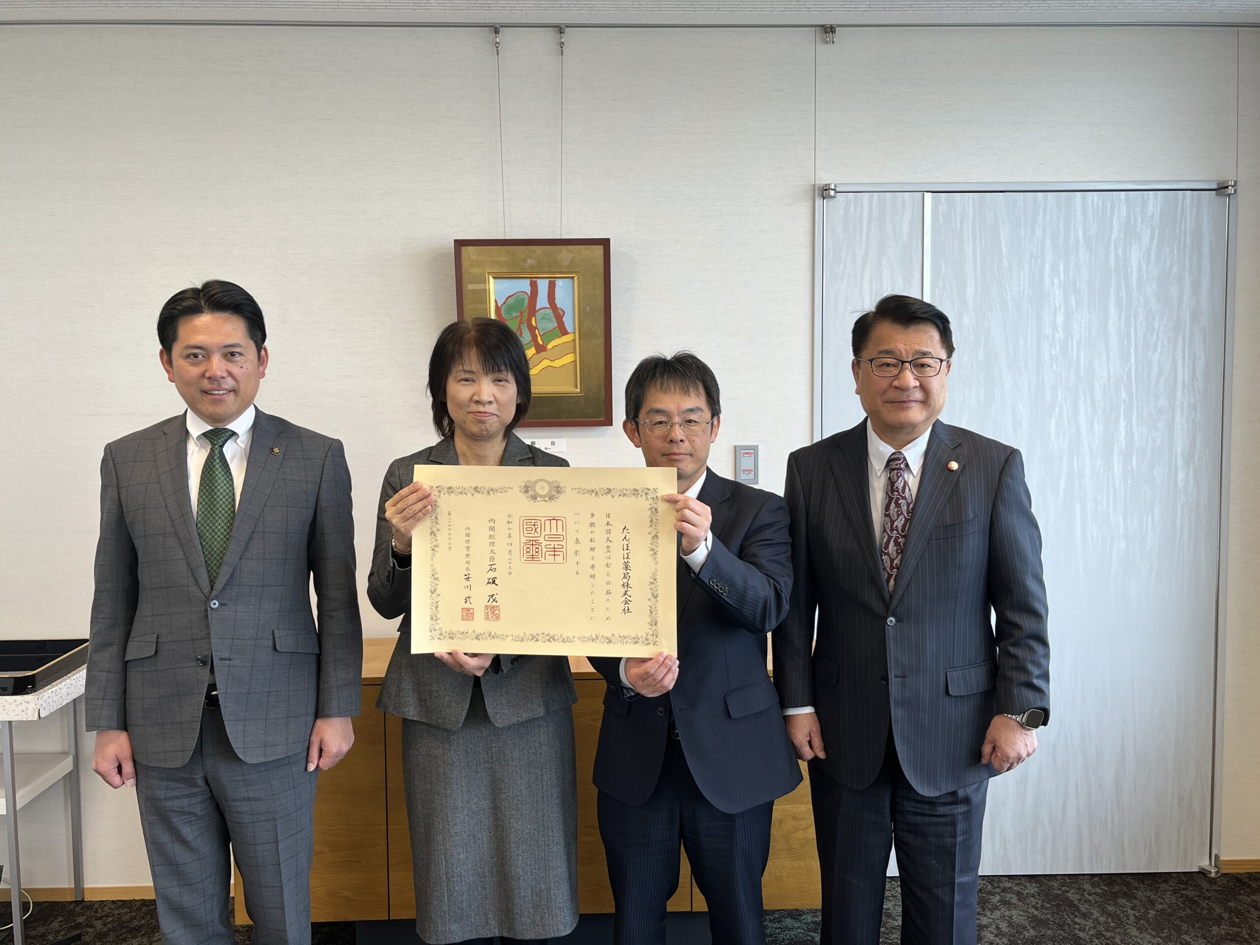 2月5日(木)、「紺綬褒章」受章伝達式が岐阜市役所にて執り行われ、たんぽぽ薬局株式会社が紺綬褒章を受章し、柴橋市長より受章伝達を賜りました。本受章は、岐阜薬科大学における「社会薬局薬学寄附講座」設置に関する当社の貢献をご評価いただいたものです。