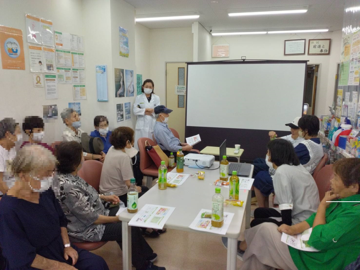 堅苦しい雰囲気ではなく、お茶やお茶菓子を楽しみながら、認知症研修認定薬剤師の鈴木さん(千早店スタッフ)による講義をリラックスして聞かれていました。